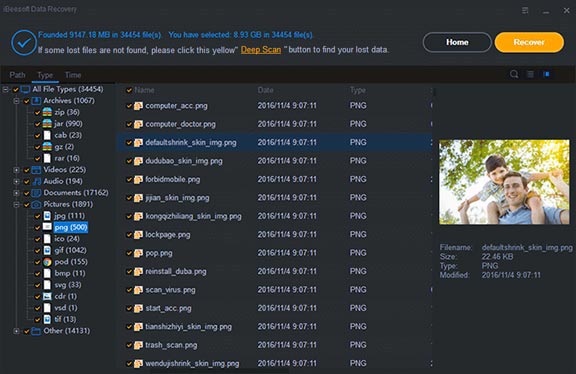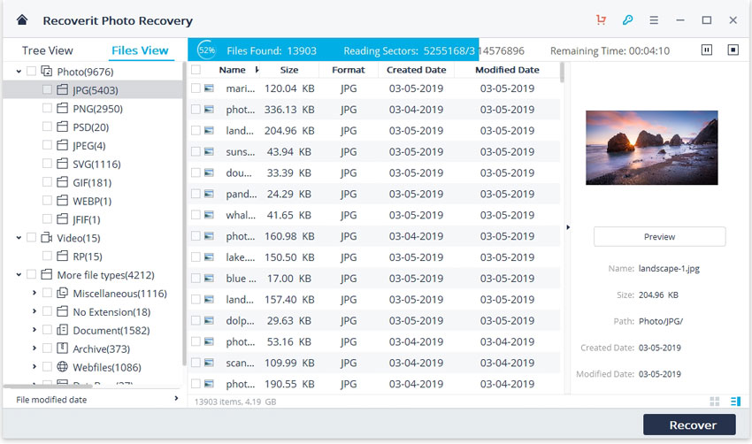 选项扫描文件类型和按文件类型排序,确保更快的恢复过程。您还可以在扫描过程中预览恢复的文件。