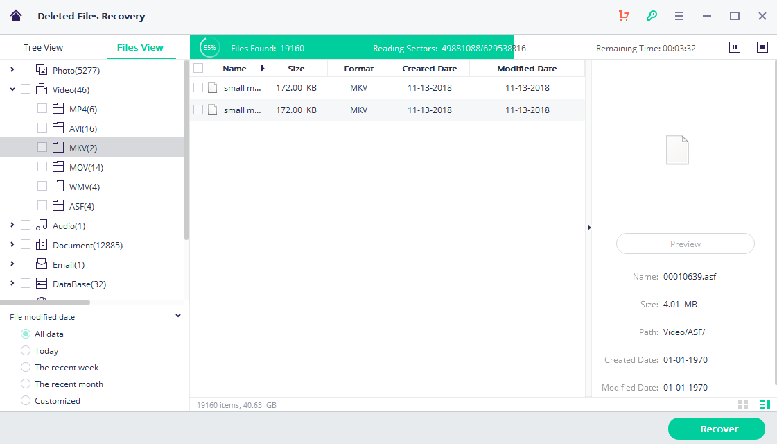 该软件支持流行的视频格式,但仅限于MOV, MP4, M4A, 3GP, 3G2, WMV, ASF, SWF, M2TS, MKV, MTS和WAV文件。此外,它还可以恢复照片和音频文件。