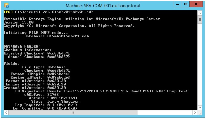 的EseUtil提供了一堆关于Exchange数据库文件的信息。但是,要检查的最重要的事情是数据库的状态,如下所示。