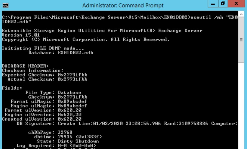 在Exchange Server上,以管理员身份打开命令提示符并浏览到受影响的EDB文件的位置。输入以下命令获取数据库的状态。