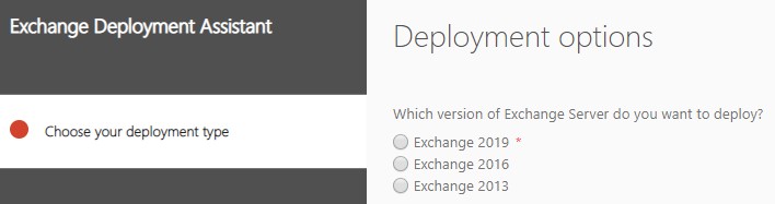 现在,当您单击“本地Exchange部署”时,您将看到迁移或安装新Exchange Server的部署选项。你被问到的第一件事是你想安装哪个版本的Exchange服务器——Exchange 2019、Exchange 2016还是Exchange 2013。