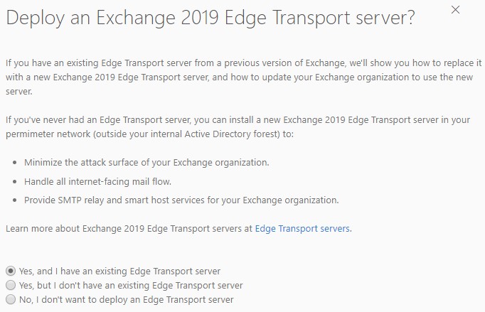 边缘服务器用于使您的Exchange服务器可以从外部直接使用Outlook访问,并为邮件服务器添加另一层保护。如果您有现有的边缘传输服务器,将指导您如何迁移到边缘服务器2019。如果你不想设置这个,你的服务器将不会暴露在互联网上。你可以点击“是”来安装一个新的服务器,即使你没有。