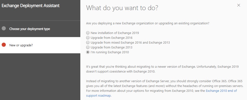 注意:对于Exchange 2010,您不能直接升级到Exchange 2019,因为它们不能共存。您将看到一条消息,提示您需要先升级到Exchange 2013或2016。
