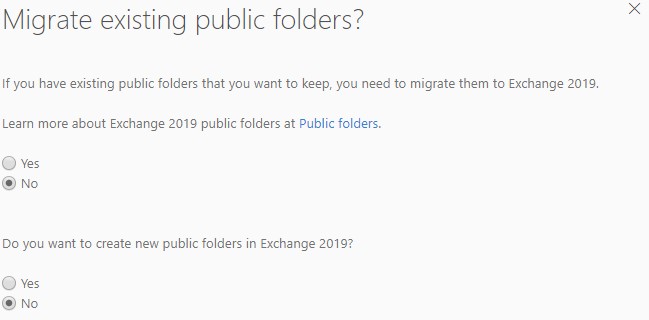 下一个屏幕是Public Folder migration。如果您有公用文件夹,并希望将它们迁移到新设置中,则可以使用此方法。如果您不使用公共文件夹,则需要在两种情况下选择“No”,这取决于您是否仍想在新设置中创建公共文件夹。如果你有,当然,你需要点击“是”。