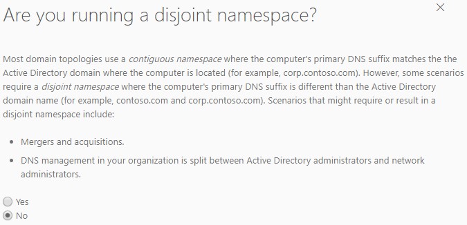 下一个屏幕是Disjoint Namespace。如果您有一个活动目录,例如corp.com,则应该回答为“否”。但是,如果您的子域名由于合并或收购而具有不同的DNS后缀,则需要回答“是”。
