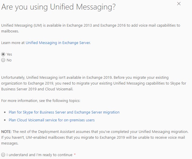 下一个选项是统一消息。关于迁移到Exchange 2019需要知道的一件事是,统一消息在此版本中不可用。对于UM服务,您需要找到替代解决方案。如果您单击“是”,您将被引导到“计划Skype for Business服务器和Exchange服务器迁移”或“为您的本地用户计划云语音邮件服务”。
