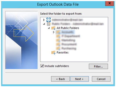- 将显示邮箱的完整结构以及所有帐户可访问的文件夹。现在,展开Public Folders,找到要导出的文件夹并单击它。确保选中Include子文件夹复选框,然后单击Next。如果您想设置一些过滤选项,请单击Filter按钮。