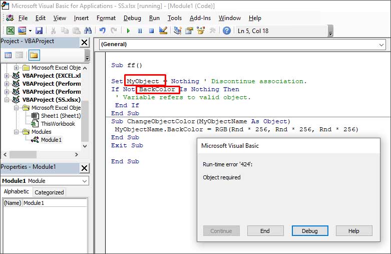 当使用不正确的对象名称运行VBA代码时,可能会发生运行时错误424。例如,对象名称是“MyObject”,但你使用的是“Backcolor”。