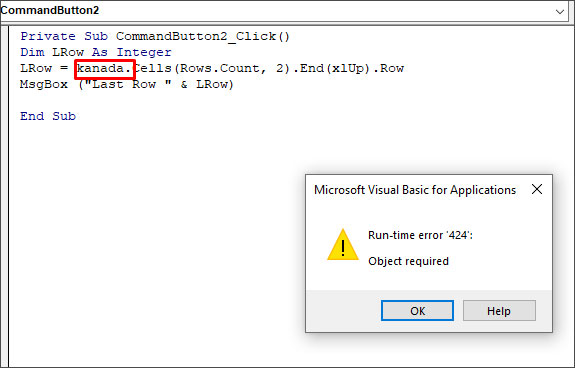 在这段代码中,工作表(“第一”)是数据对象。如果我错误地删除了这个数据对象,并插入了任何随机的名称(例如- canada),那么它将无法被Excel识别。当我运行这段代码时,我将得到“运行时错误424”。