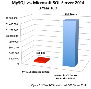 此外,MySQL授权版- MySQL企业版的总拥有成本(TCO)与MS SQL Server企业版相比要低得多。