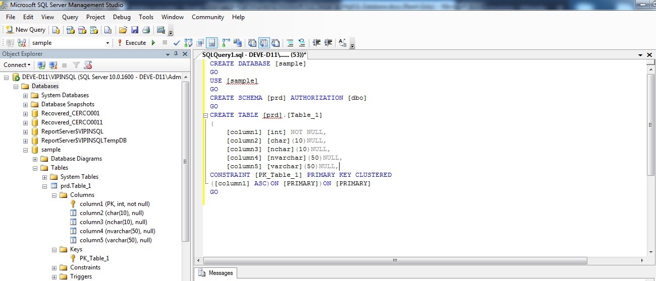 为了理解模式转换的过程,让我们用一个名为“Table_1”的新表创建一个示例数据库。为此,打开SQL Server迁移助手(SSMA)并输入以下代码片段: