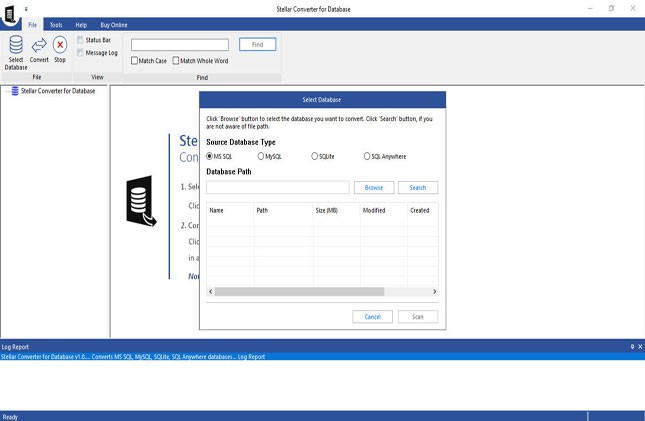 从软件主界面,在选择数据库窗口中,选择MS SQL作为源数据库类型。接下来,单击浏览或搜索下数据库路径选择要转换的数据库。然后,点击扫描。