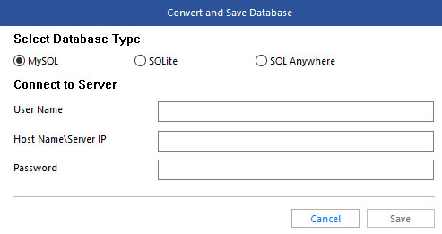 从预览窗口选择要转换的对象,然后单击“在文件上转换”菜单。在转换和保存数据库窗口中,选择MySQL下选择“数据库类型”。填写连接到服务器详细信息,然后单击Save。