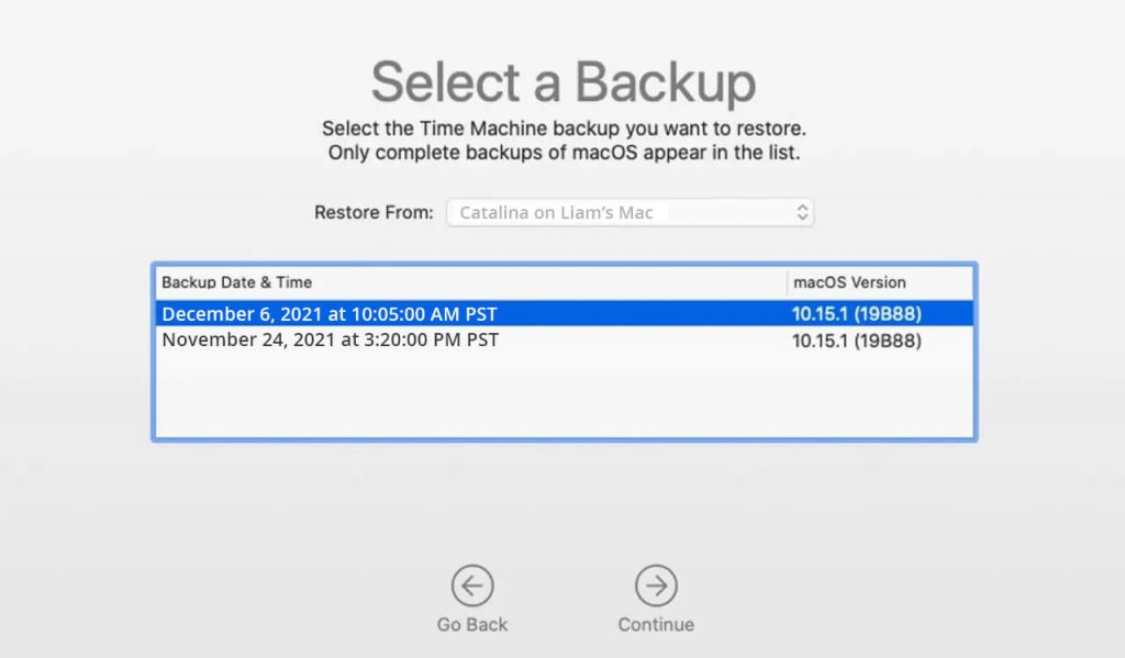 - 时间机器打开并显示可用的备份。单击最近的备份日期。
