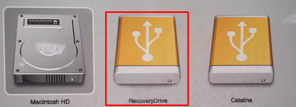 对于基于英特尔的Mac,打开系统电源,然后按住选项关键。松开一次键启动管理器打开。选择USB恢复驱动器,然后点击返回。
