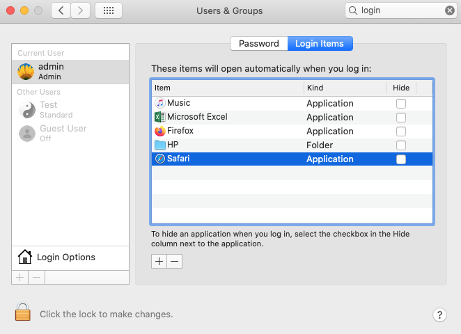 Step 3)Click theLogin Itemstab. Click the lock icon and provide an admin password to unlock it.