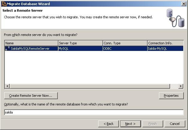 第十步:您将回到迁移数据库向导。在向导中,选择新创建的SakilaMySQLRemoteServer,然后点击下一个.