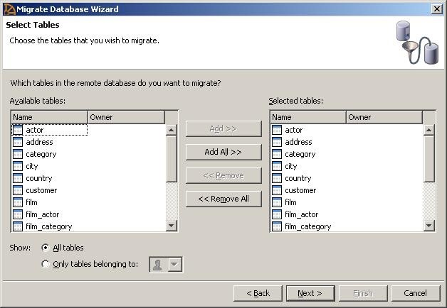 步骤11:在“选择表”屏幕中,从“sakila要移动的左侧列表框中的'数据库'。选中表后,单击Add All,然后下一个.