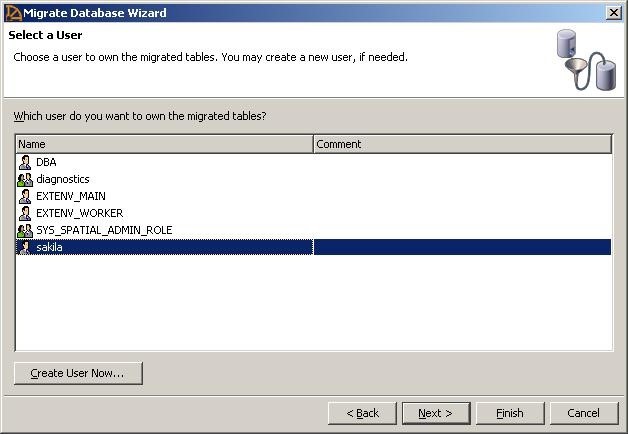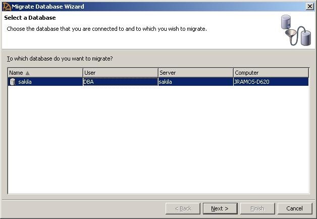 步骤16:将出现“迁移数据库向导”窗口。选择新创建的用户'sakila’,然后点击下一个.