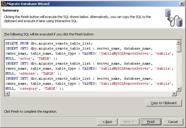 步骤18:Summary屏幕显示将由Migrate Database Wizard执行的SQL语句,用于迁移数据库模式和数据。