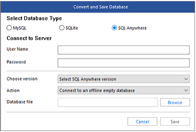 选择的MySQL数据库文件将被转换为SQL Anywhere数据库文件格式。