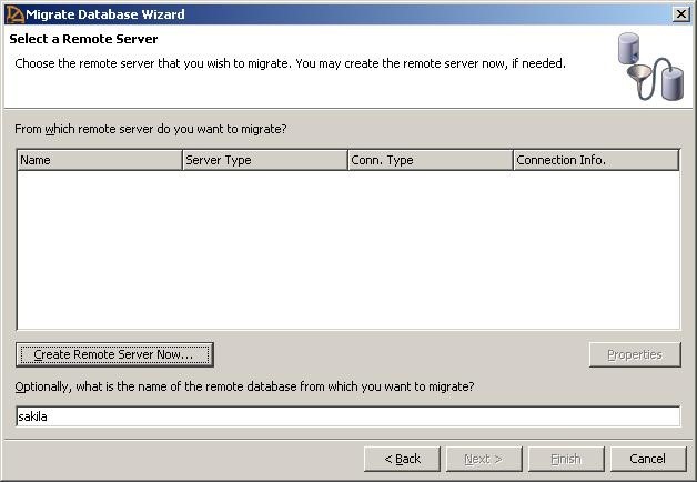 步骤3:输入的sakila’作为要从中迁移的远程数据库的名称,然后单击立即创建远程服务器。