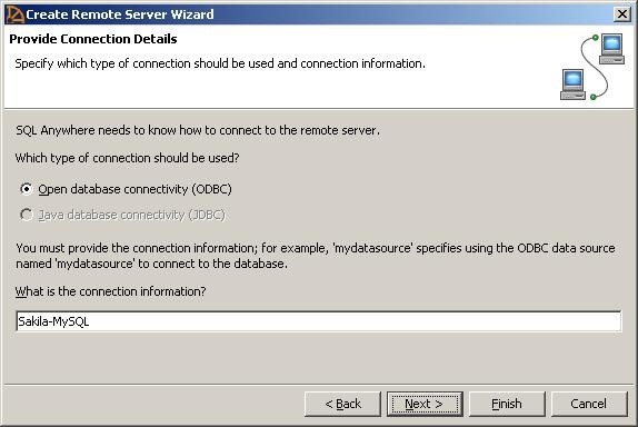 步骤6:在提供连接详细信息屏幕上,选择开放数据库连接(ODBC);并在连接信息文本框中输入MySQL数据库的ODBC数据源的名称(即之前创建的MySQL ODBC源数据)。点击下一个.