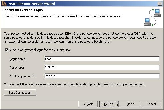步骤8:将SQL Anywhere数据库连接为DBA.由于远程服务器(MySQL)不知道这个用户,您应该创建一个外部登录,将SQL Anywhere DBA映射到MySQL用户。接下来,检查'为当前用户创建外部登录’复选框,并输入正确的凭据,登录MySQL数据库服务器。点击下一个.
