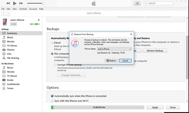 对于那些维护iTunes备份的人来说,这是找回iPhone删除照片的最简单的方法。iTunes备份还有助于恢复因删除或出厂复位而丢失的照片。