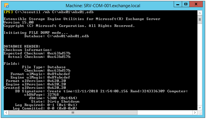 | Eseutil / MH | 显示数据库状态,即脏关机(不一致)或干净关机(一致) |