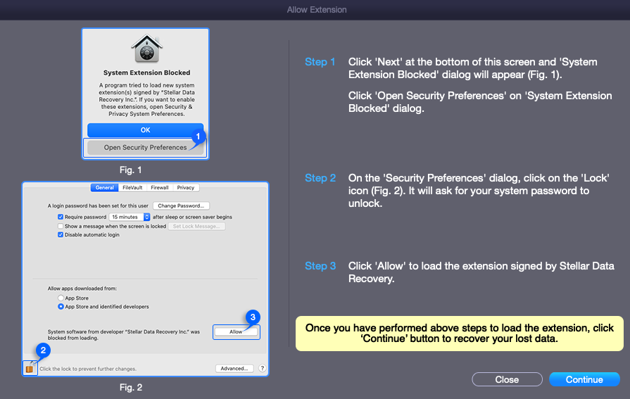 请注意:在对任何卷执行深度扫描时,欧宝娱乐app下载地址恒星数据恢复欧宝app官网登录需要软件来启用内核扩展(KEXT).该进程仅在第一次启动深度扫描进程时需要设置。