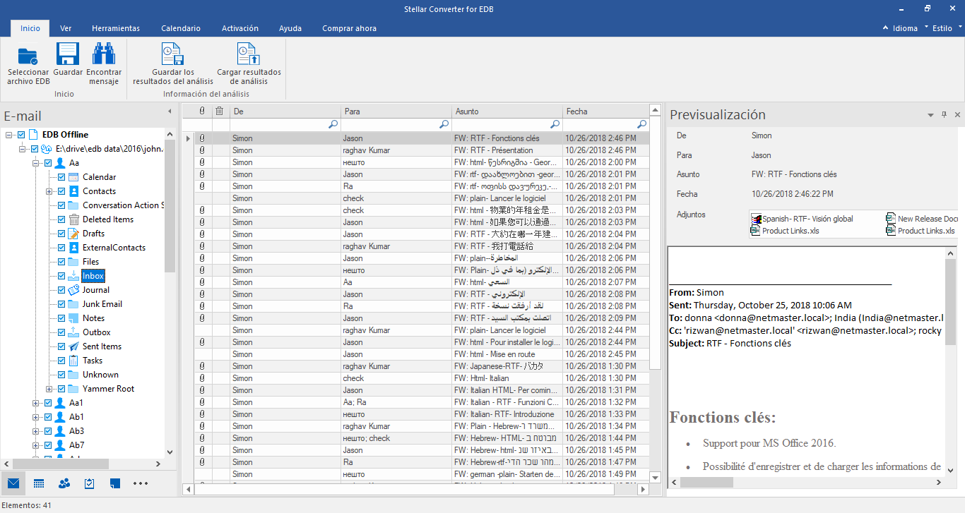 恒星转换器的EDBphone a su disposición múltiples functions para previsualar SUS电子邮件,日历,联系人,区域,备注,búsquedas我的日记, en la partte superior del panel izquierdo。允许修改/重建的tamtamen面板Opciones del Panel Navegación.