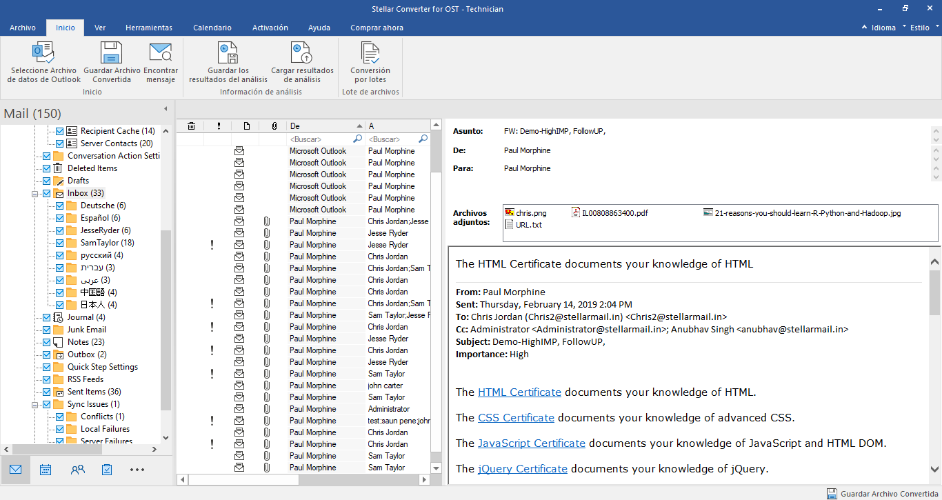 恒星转换器为OST允许对档案进行预可视化。La vista previa de los datos contenidos和La bandeja de correos是由三个面板组成的结构:izquierdo, central - derecho, tal - comcomse explica continuación。