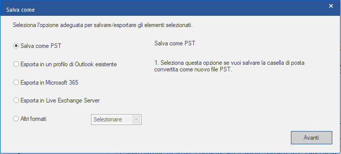 5. Appare la finestraSalva come PST, selezionaComprimi e salva PSTe clicca suAvanti.