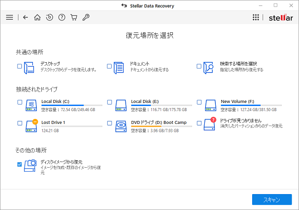 Stellar Data Recoveryで作成するイメージは、対象となるハードディスク、USBメモリ、またはボリュームと同じ容量になります。イメージファイルを保存する場所に十分な空き容量があることを確認してください。