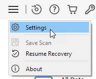 Click this button to access menu options such asSettings, Save Scan, Resume Recovery, andAbout. |