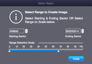 要创建所选区域的图像,请单击高级设置。来自“选择要创建映像的范围’屏幕,拖动滑块来定义图像文件的起始和结束扇区。点击关闭,然后点击下一个。