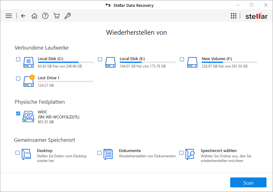 Manchmal können Sie Ihre Daten nicht wiederherstellen, indem Sie die Optionen Schnellsuche und Tiefensuche. Dies geschieht aufgrund einer schweren Korruption oder Partitionsbeschädigung auf dem physischen/auswechselbaren Datenträger. In diesem Fall können Sie mitStellar Data RecoveryIhre Daten mit der OptionPhysische Laufwerkewiederherstellen. Diese Option unterstützt sowohl interne als auch externe Festplatten. Die Funktion Physikalische Datenträger arbeitet mit Raw Recovery zusammen, um die stark beschädigten Daten wiederherzustellen, und hat bessere Chancen auf Wiederherstellung.