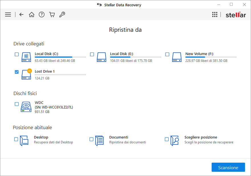 Nota:Se su un disco rigido sono presenti più spazi non allocati, inUnità collegateappariranno comeUnità persa 1,Unità persa 2e così via. È possibile selezionare per il recupero solo un'unità alla volta.