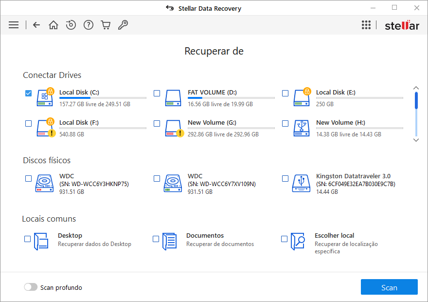 O software também permite selecionar qualquer unidade conectada ou um local específico em uma unidade ou mídia de armazenamento conectada ao sistema. O software oferece as seguintes opções de seleção: