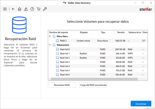 Los volúmenes RAID se muestran en la pantalla principal, debajo del botónRecuperacion突袭.