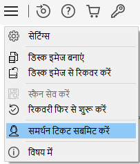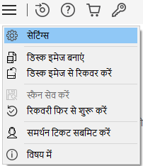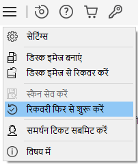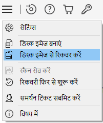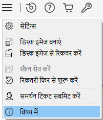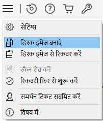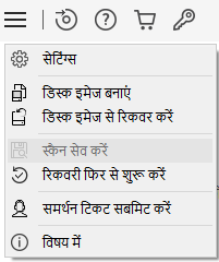 सेटिंग्स,डिस्क इमेज बनाएँ,डिस्क इमेज से रिकवर करें,स्कैन सेव करें,रिकवरी फिर से शुरू करें,औरअबाउटजैसेमेनूविकल्पोंतकपहुंचनेकेलिएइसबटनपरक्लिककरें। |