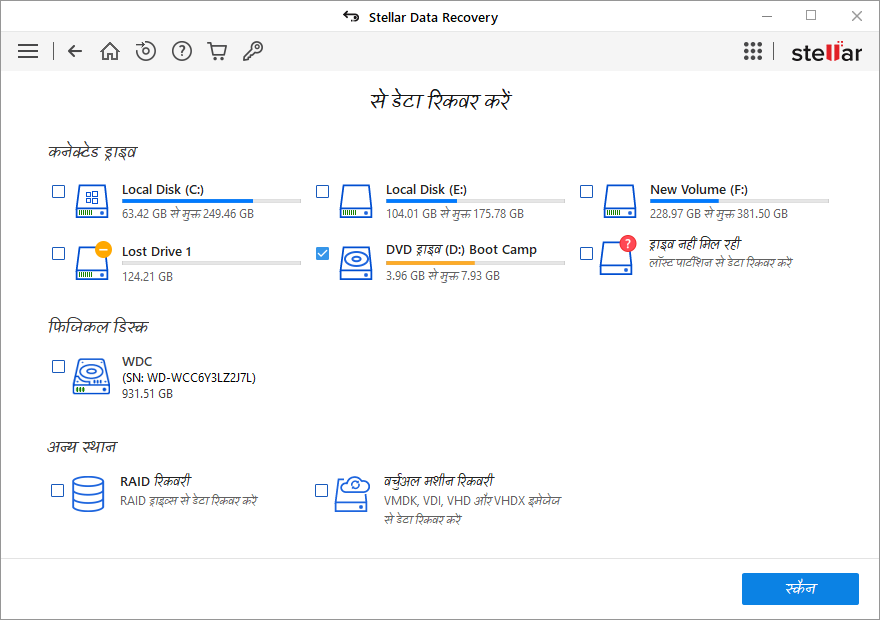 4.रिकवर फ्रॉम स्क्रीनपरकनेक्टेडड्राइवसेसीडी/डीवीडीवॉल्यूमको सलेक्ट करें।