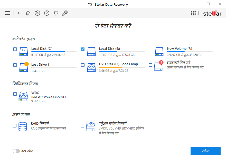 नोट:रिकवरीके लिए एक बार मेंआपकेवल एक वॉल्यूमकोसलेक्टकर सकते हैं।डीप स्कैन केवल कनेक्टेड ड्राइव के लिए लागू है।यदिआपक्विकस्कैन करना चाहते हैं तो आप डीप स्कैन कोडिसेबलकर सकते हैं।