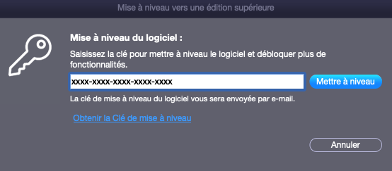 5. Saisissez laClé de mise à niveau(reçue par e-mail après avoir acheté la mise à niveau du produit) puis cliquez sur le boutonMise à niveau(Merci de vérifier que vous disposez d’une connexion Internet et que celle-ci est active).