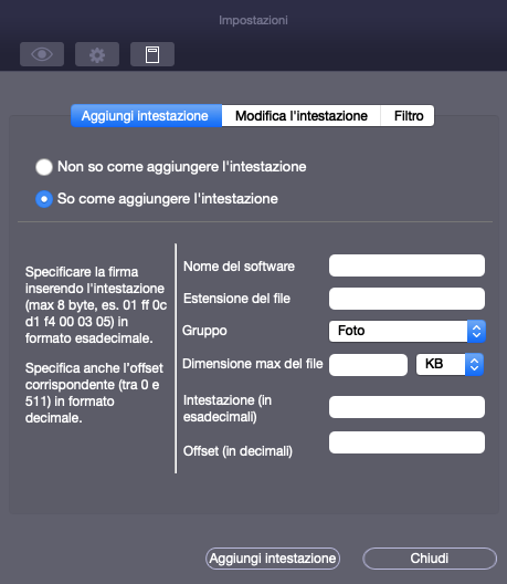 InStellar Photo Recoveryutilizzando l’opzioneAggiungi Intestazionenella finestraPreferenzeè possibile aggiungere nuovi tipi di file in un elenco predefinito di tipi di file supportati dal software.