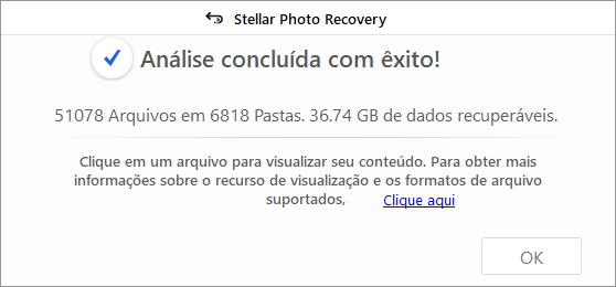 5. Uma vez concluído o processo de digitalização, os detalhes dos arquivos e pasta encontrados são exibidos em uma caixa de diálogo.