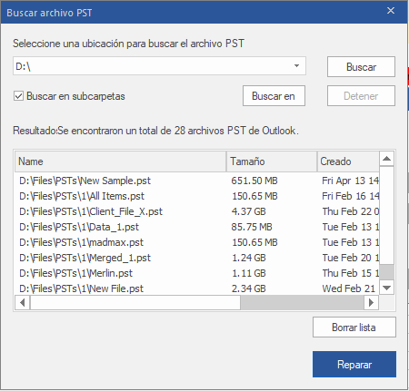 h) La lista de archivos PST encontros en La partición或carpeta seleccionadas se mostrararen La sección deResultados.选择档案档案和设计档案。建议单独进行选择,并将其保存在档案中。
