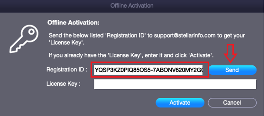 步骤2:“离线激活”窗口会自动生成一个登记身份证。单击发送按钮创建电子邮件,地址为support@stellarinfo.com。购买软件后,将激活密钥添加到电子邮件中,并发送。