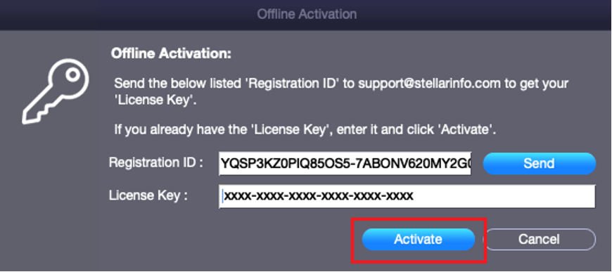 步骤3:Stellar代表将验证详细信息并发送给您许可证密钥。在离线激活窗口中插入许可密钥,然后单击激活。